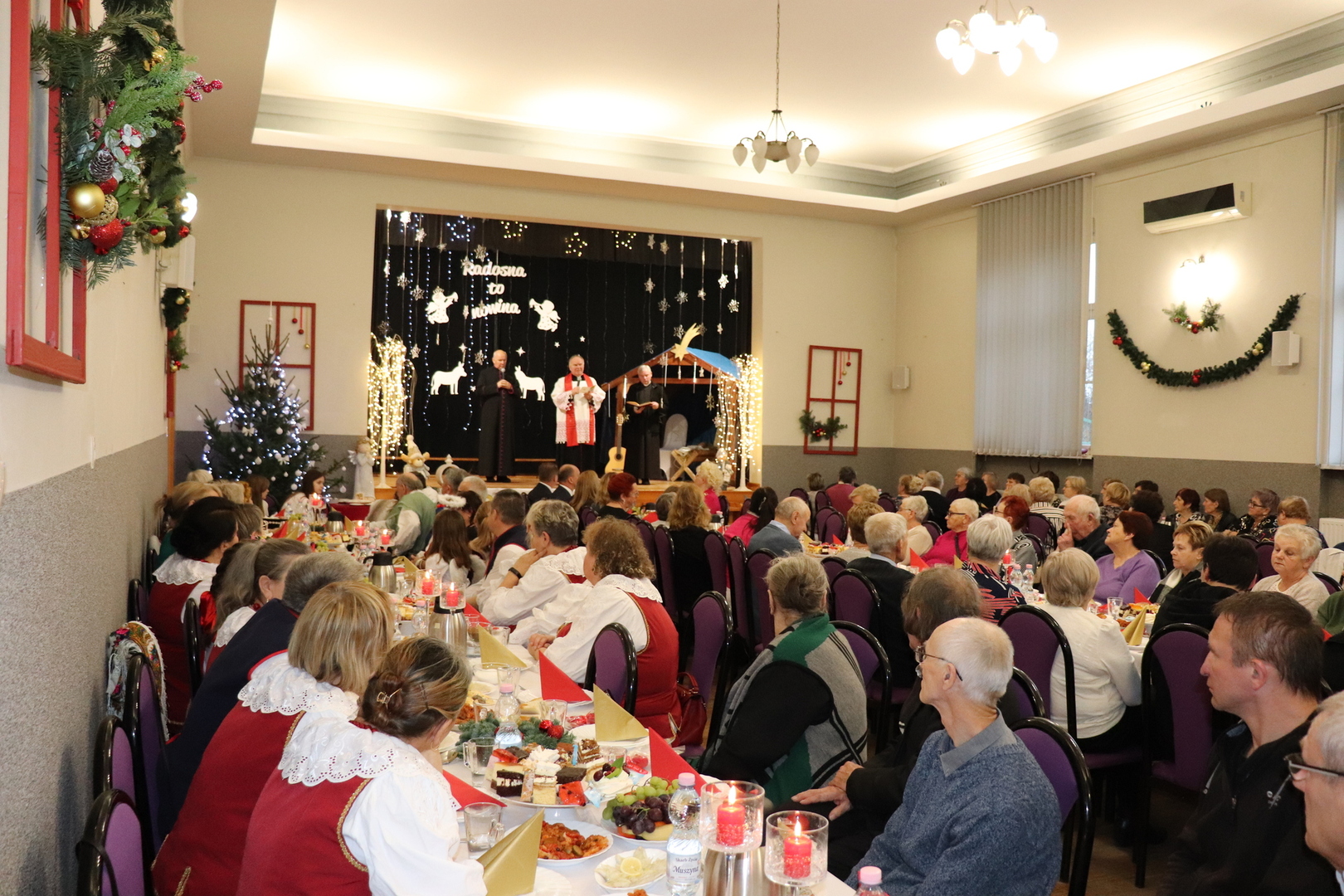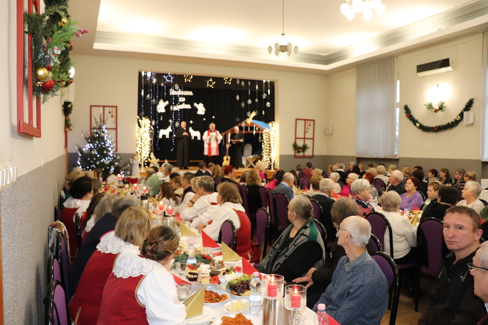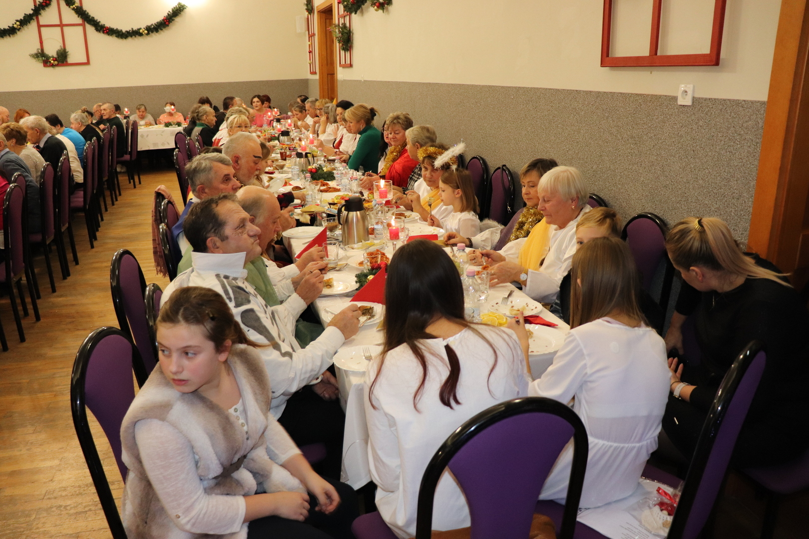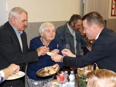 W drugiej części Naszego spotkania Ks. Kanonik Stanisław Czerwiński z parafii Jakubów wraz z Ks. Kanonikiem Edwardem Białasem z parafii Brzeg Głogowski oraz ks. Janem Krawczykiem z Parafii pw. Jana Chrzciciela w Kurowie Wielkim wspólnie dokonali obrzędu opłatkowego. Nastąpiła najbardziej oczekiwana chwila przełamania się opłatkiem i złożenia sobie wzajemnie życzeń. W tym radosnym nastroju Świąt Bożego Narodzenia wszyscy zasiedli do wigilijnej wieczerzy.