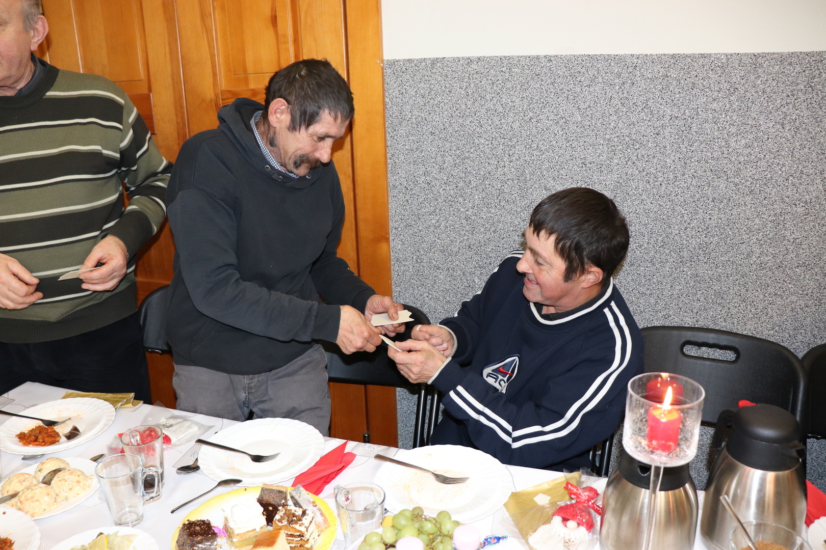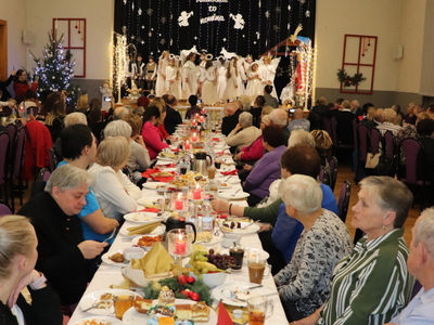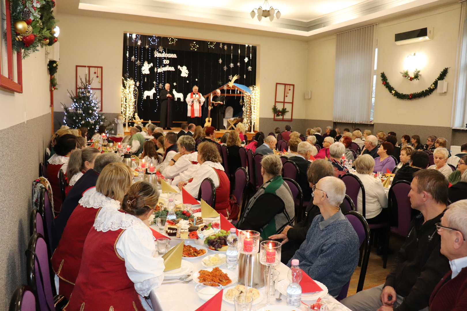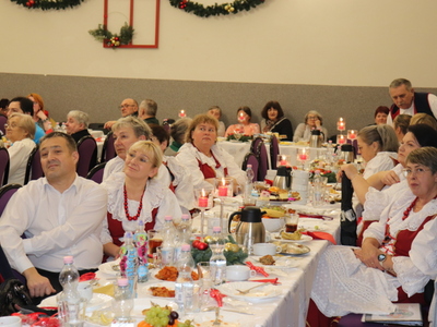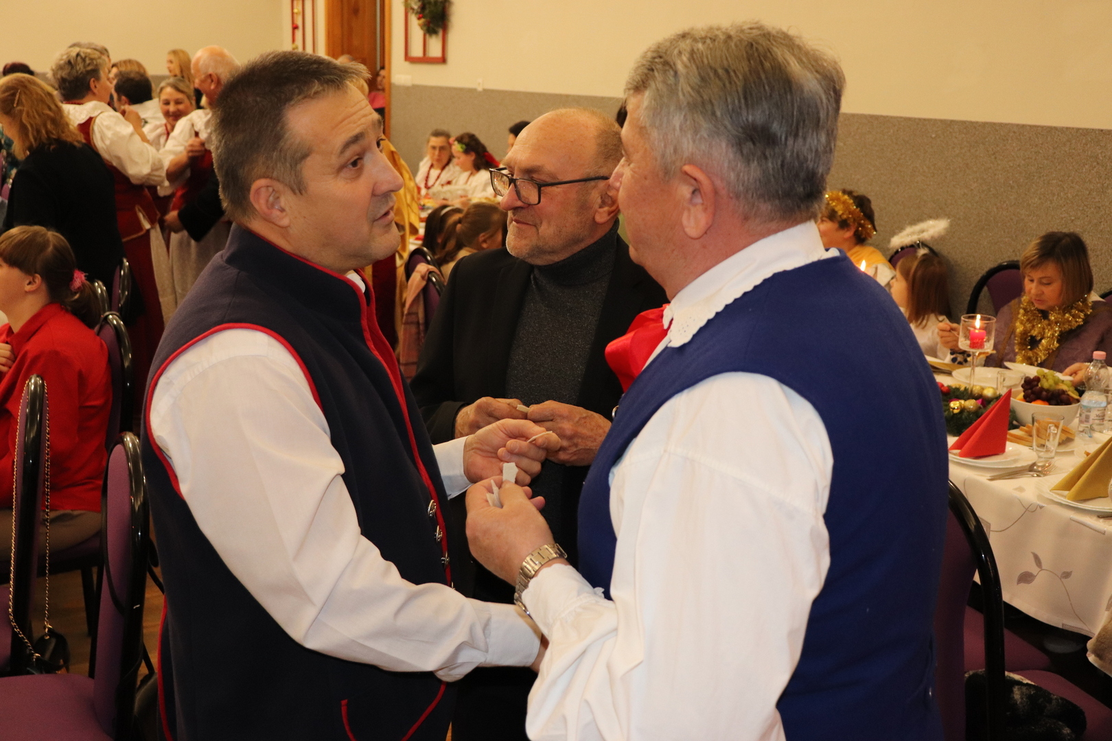 W drugiej części Naszego spotkania Ks. Kanonik Stanisław Czerwiński z parafii Jakubów wraz z Ks. Kanonikiem Edwardem Białasem z parafii Brzeg Głogowski oraz ks. Janem Krawczykiem z Parafii pw. Jana Chrzciciela w Kurowie Wielkim wspólnie dokonali obrzędu opłatkowego. Nastąpiła najbardziej oczekiwana chwila przełamania się opłatkiem i złożenia sobie wzajemnie życzeń. W tym radosnym nastroju Świąt Bożego Narodzenia wszyscy zasiedli do wigilijnej wieczerzy.