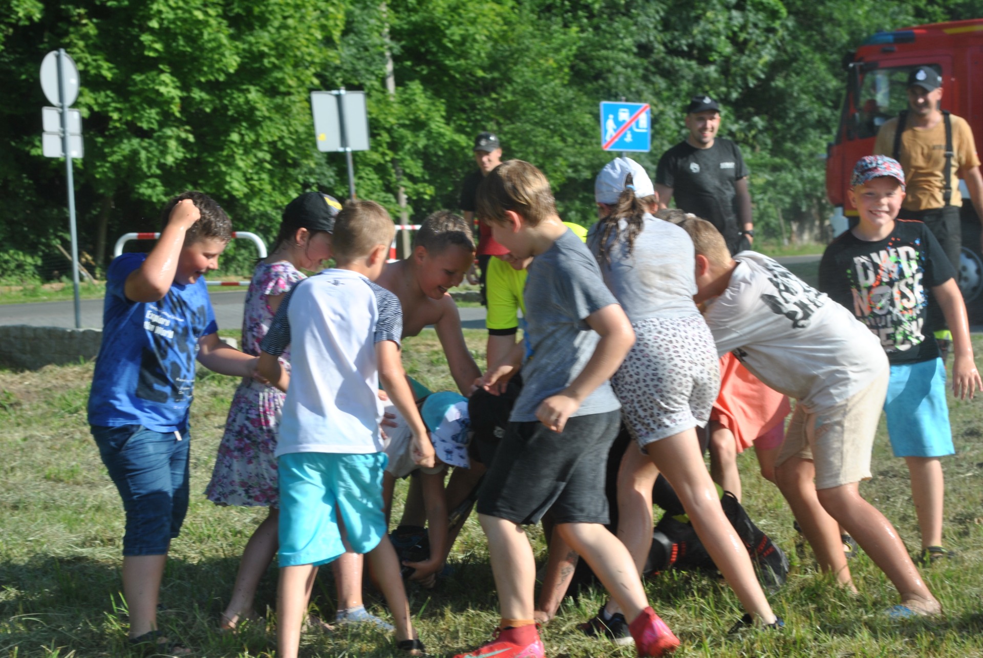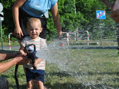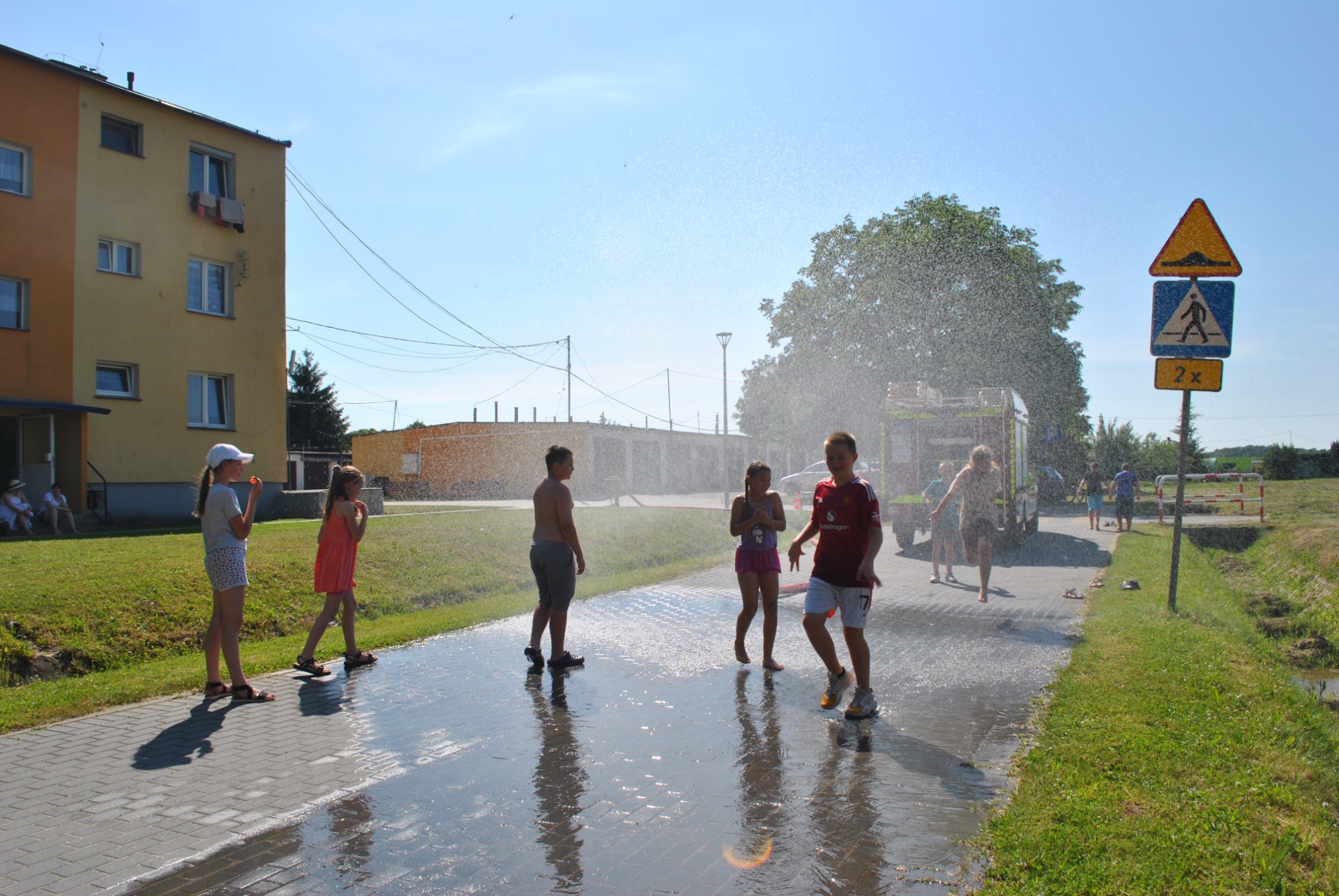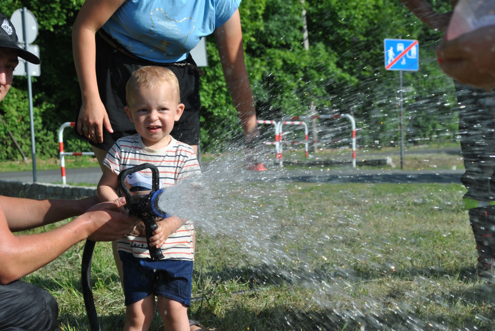 Strażacy z OSP Kromolin i OSP Dobrzejowice przygotowali dla uczestników kurtynę wodną, która w ten upalny dzień zapewniła uczestnikom upragnione orzeźwienie.